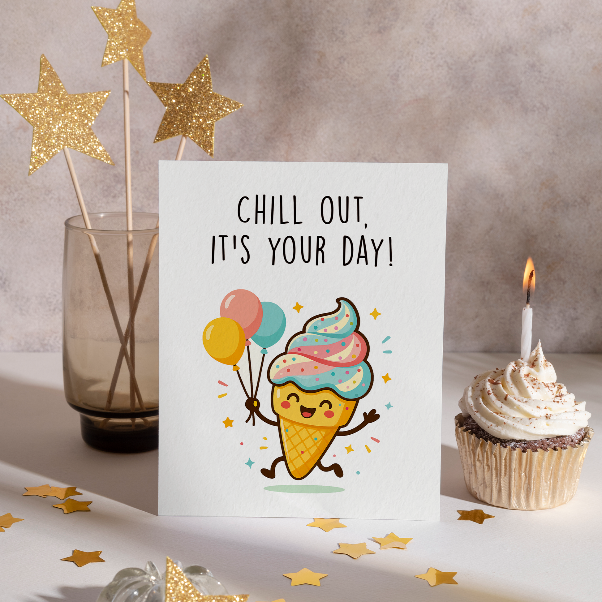 A sweet and playful greeting card featuring a happy ice cream character holding balloons, perfect for birthdays or feel-good celebrations. Designed to bring a relaxed, joyful vibe, this card is ideal for reminding her to slow down, enjoy the moment, and celebrate her day with smiles and sweetness.