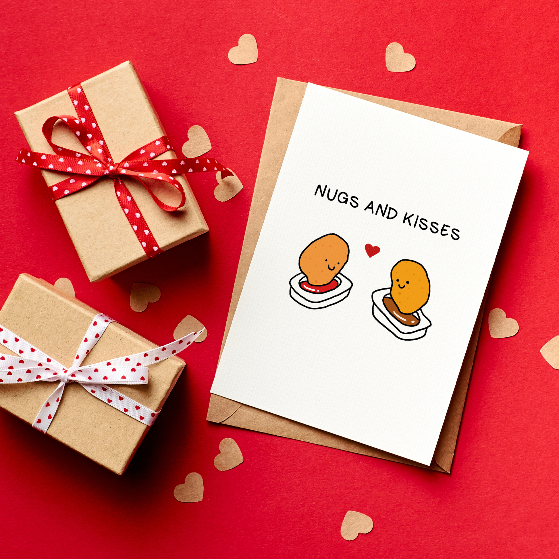 “Nugs and Kisses” is a fun Valentine’s card for couples who love food and laughter. Featuring a playful food pun and two adorable chicken nuggets with dipping sauce, it’s a sweet way to say I love you without being cheesy.
